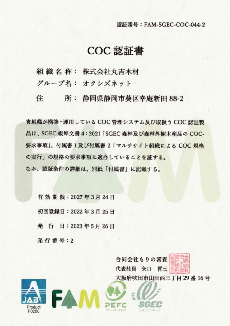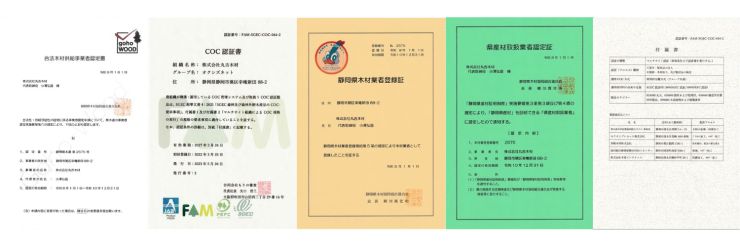 SGEC/PEFC COC認証・合法木材・静岡県産材認定・静岡市柱プレゼント助成金対象品など、各種証明・制度要件に対応。申請段階からご相談いただけます。