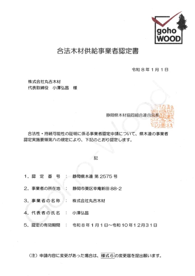 違法伐採に由来しない木材であることを証明できる合法木材供給事業者として認定。公共工事・補助金案件にも安心して対応できます。