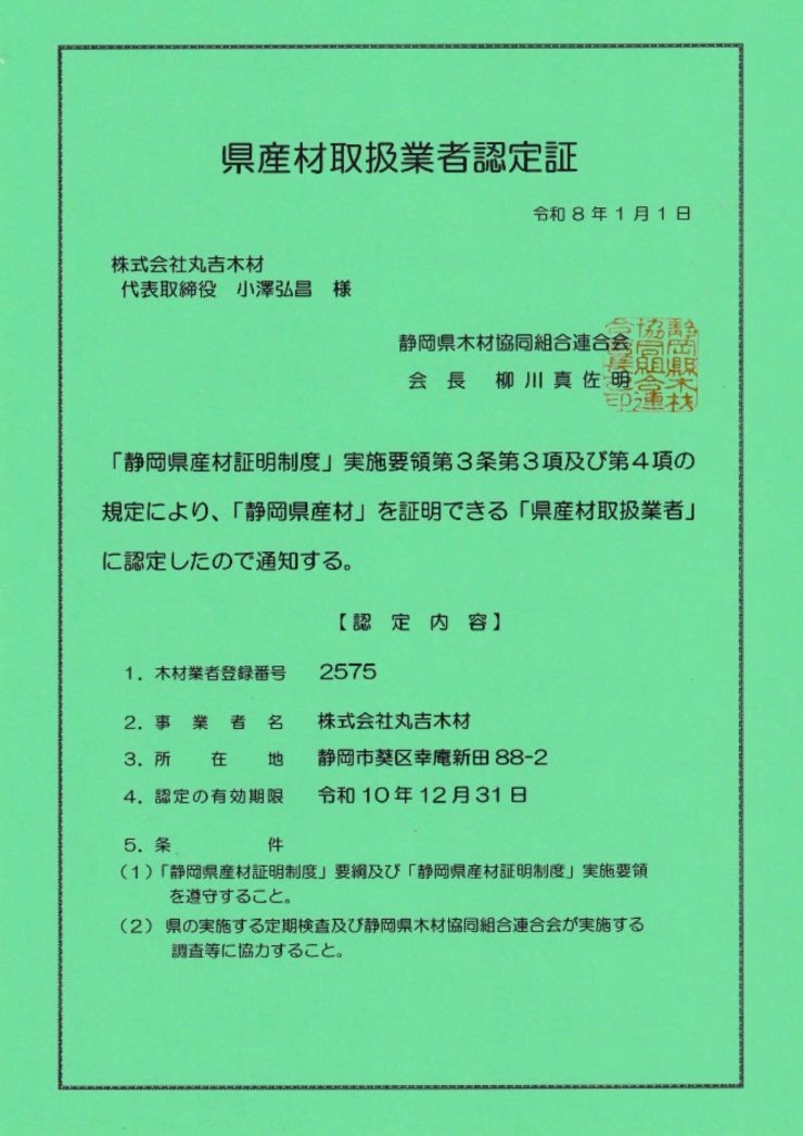 『県産材取扱業者認定証』